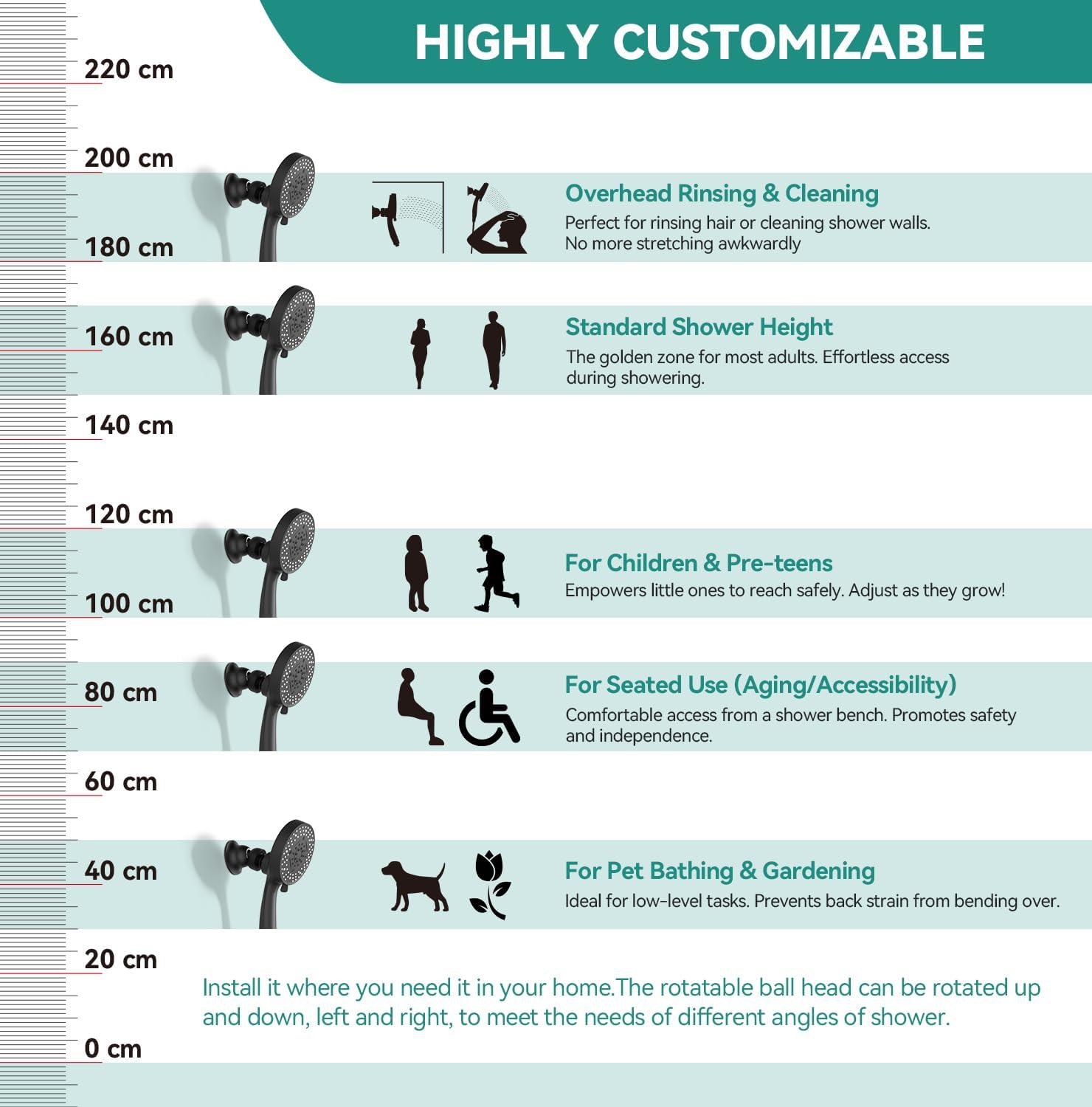 - Shower Head Wall Mount at Any Height: Suitable for installation needs at desired height, especially convenient for kids, elders and pet